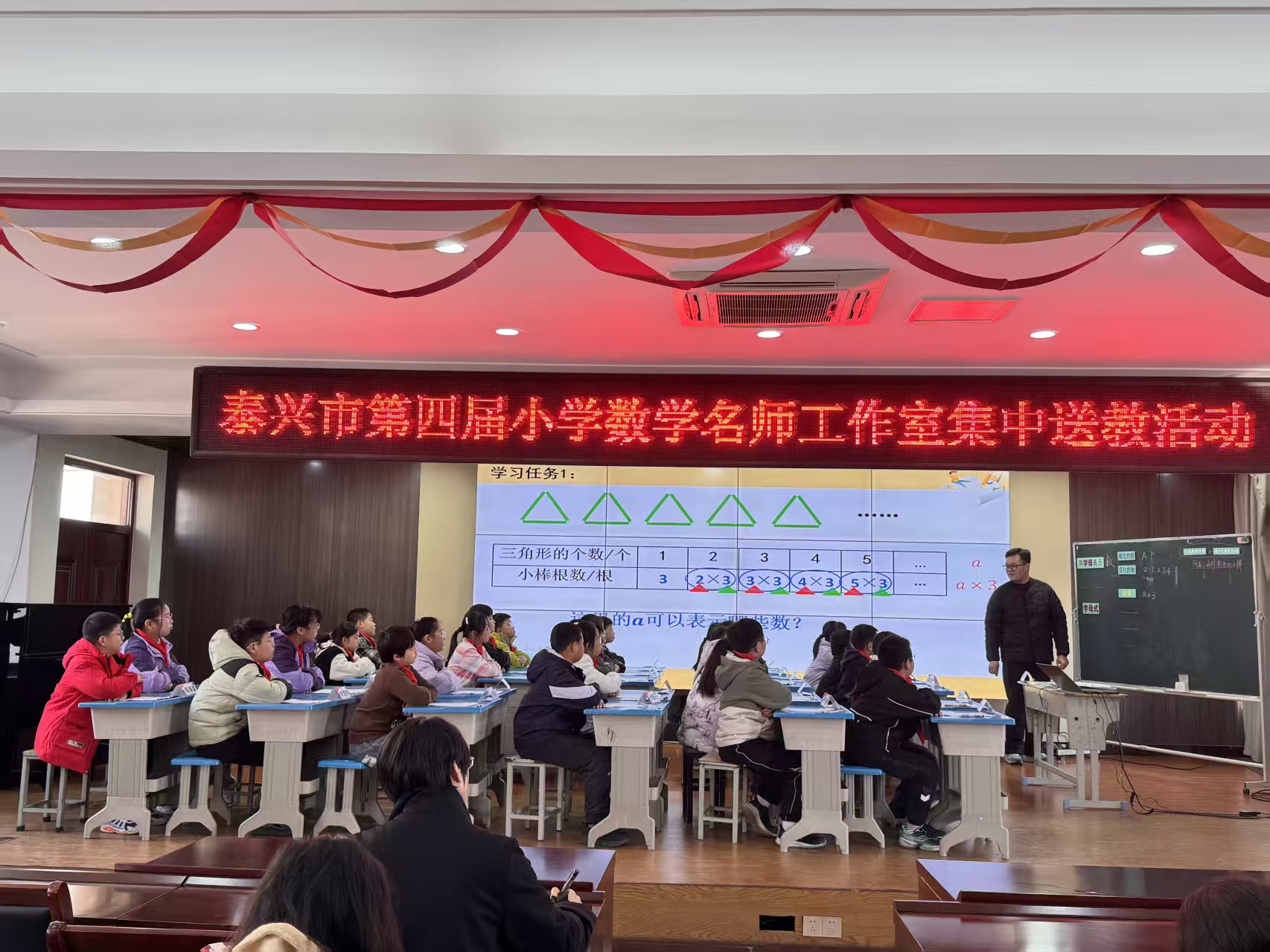 工作室成员钱富老师执教《用字母表示数》,以旧教材内容为依托,融入现代教学理念。课堂开篇从生活中的字母符号切入,通过扑克牌中“A代表1”的实例,让学生初步感知字母表示确定数的意义;随后在摆小棒情境中,引导学生发现字母“a”可表示变化的数,理解“a×3”既代表“a个三角形所需小棒根数”的具体数量,又蕴含“小棒根数与三角形个数之间的数量关系”。在抢红包任务中,学生进一步拓展认知:不仅字母“a”,任意字母均可表示数和数量关系,同时明确变化的数具有一定取值范围。整节课通过“摆小棒—抢红包—写公式”三个层层递进的学习任务,循序渐进地引导学生掌握字母式表示数量、数量关系及计算公式的多重内涵。