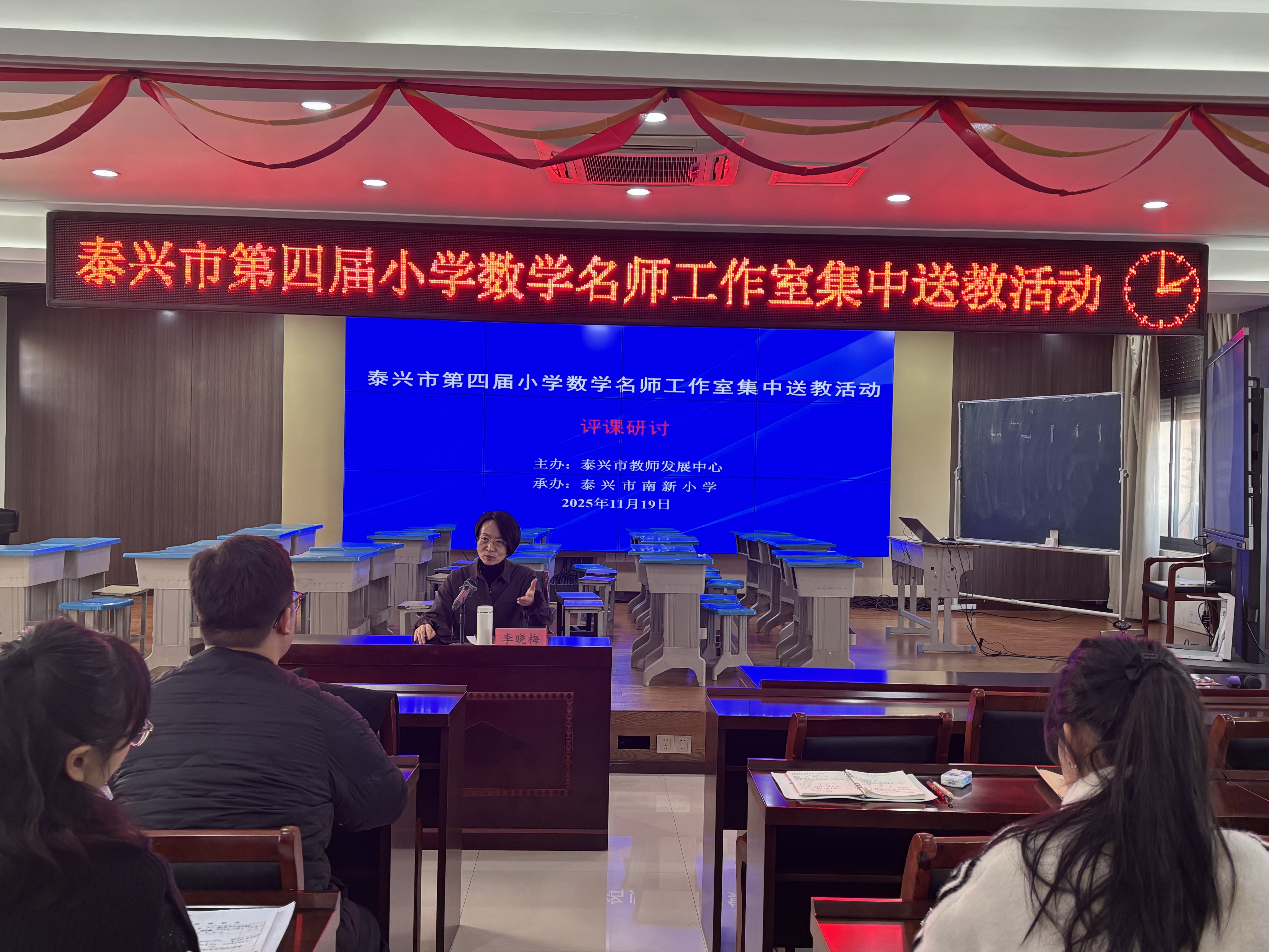 当经典教材的扎实根基碰撞新版教材的创新理念,一节数学课能绽放怎样的育人光彩?为深化教材解读精度,赋能课堂教学提质,11月19日下午,泰兴市第四届小学数学名师工作室全体成员与江苏省李晓梅网络名师工作室成员在领衔人李晓梅主任的带领下,赴泰兴市南新小学开展送教研修活动。本次活动以新旧教材同课异构为核心载体,在差异化教学设计的实践探索中,精准探寻教学本质规律,共同研讨数学育人智慧。