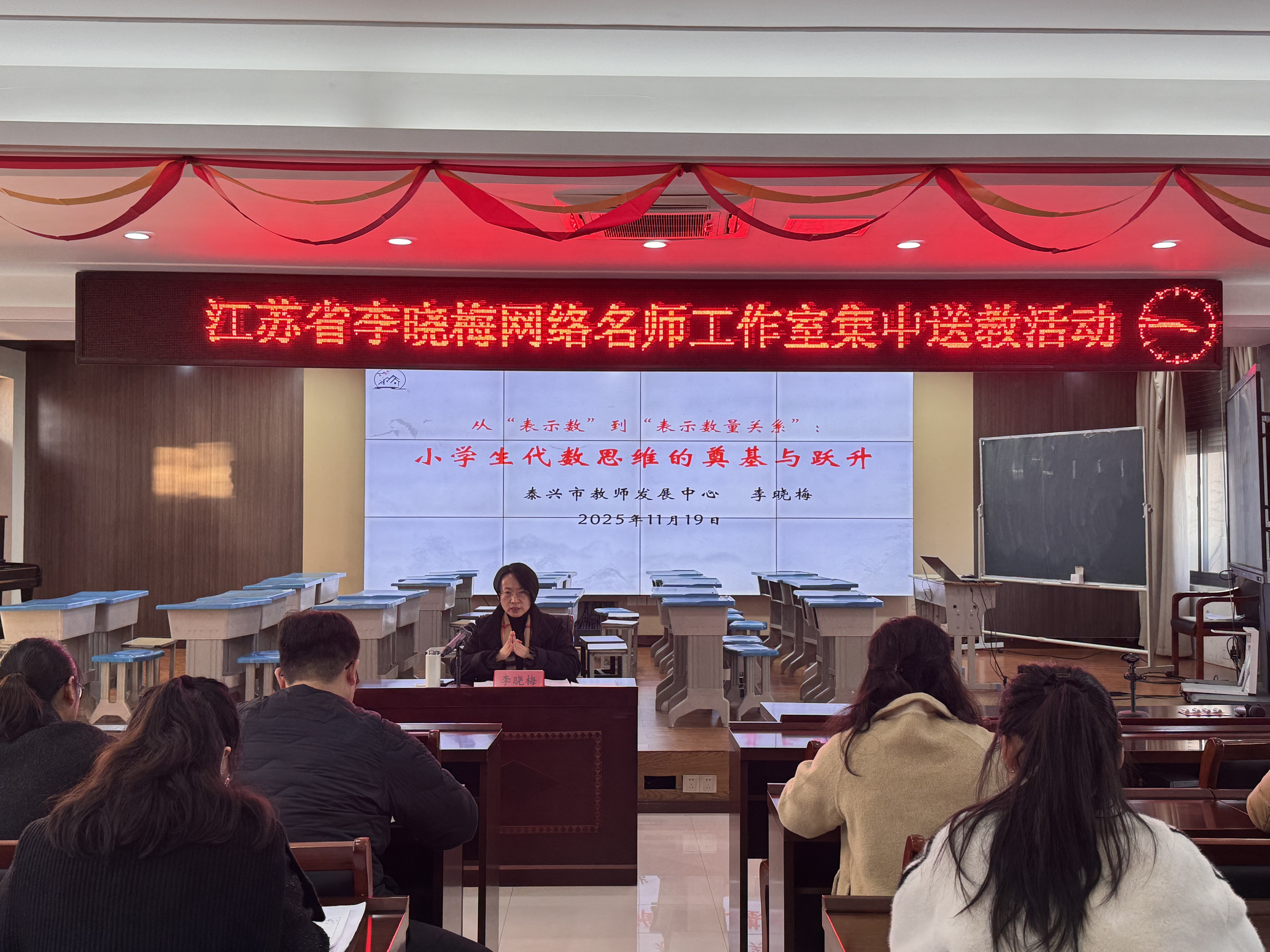 为进一步提升全体成员对代数思维教学的理解,李晓梅主任以《从“表示数”到“表示数量关系”——小学生代数思维的奠基与跃升》为题开展专题讲座。讲座从四个维度系统展开,一是溯其源:从“算术”到“代数”的思维革命,阐释从“算术”到“代数”的认知跨越;二是明其理:数是基础,关系是灵魂,提出教材的变化给出了函数思想的雏形,是模型思想的初步体验,赋予数学普遍性和力量感;三是析其变:新旧教材对比下的教学中心转移,详细解读核心定位之变、情境载体之变、教学重心之变;四是探其法:如何实现从表示数到表示关系的跃升,给出实现从“表示数”到“表示数量关系”教学跃升的具体策略。讲座最后,李晓梅主任勉励全体教师深入理解教材内涵、精准把握教学本质,创造性地使用教材,构建灵动自然、深入高效的数学课堂。