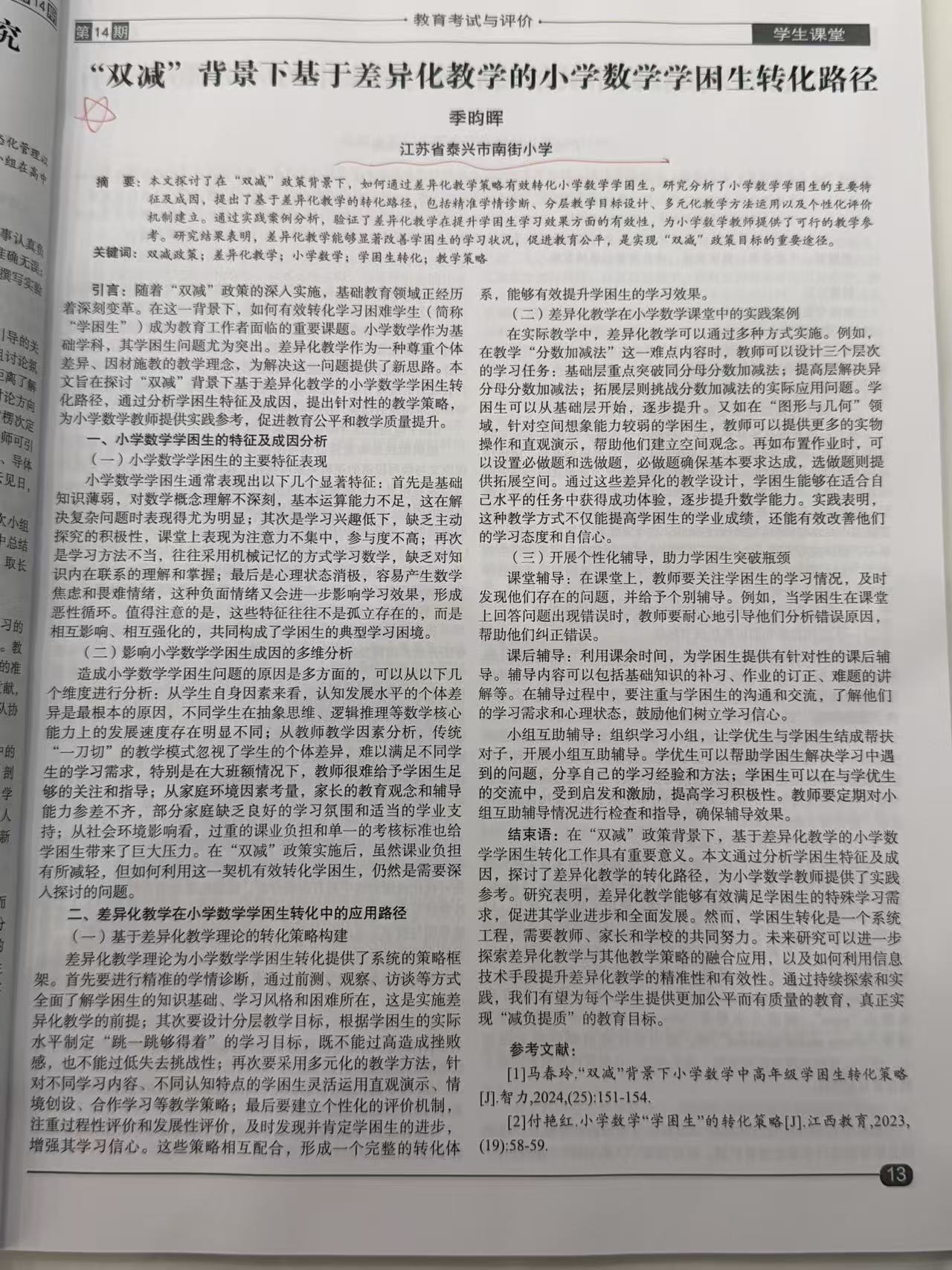 《“双减”背景下基于差异化教学的小学数学学困生转化路径》(季昀晖)