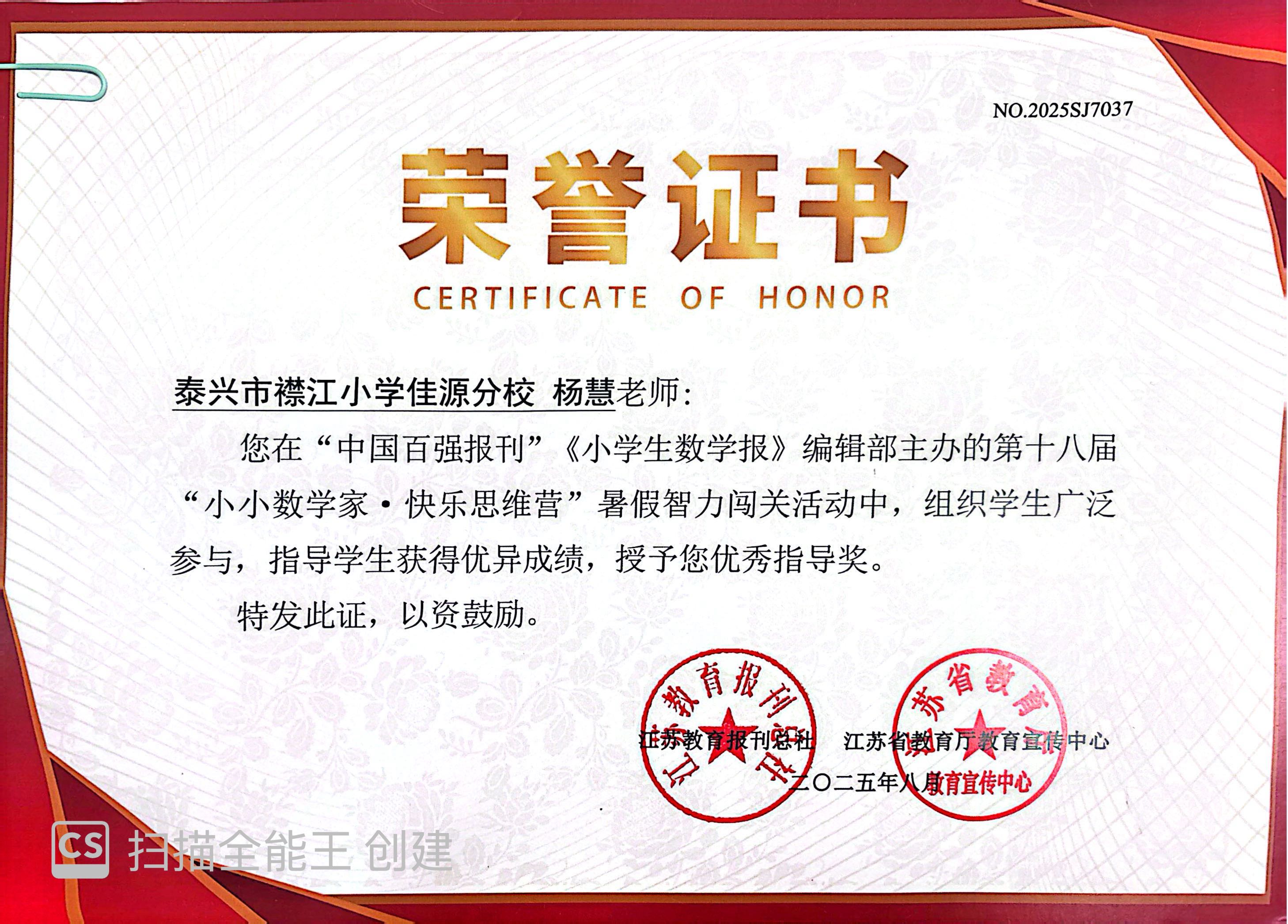 杨慧老师获2025年小数报优秀指导奖