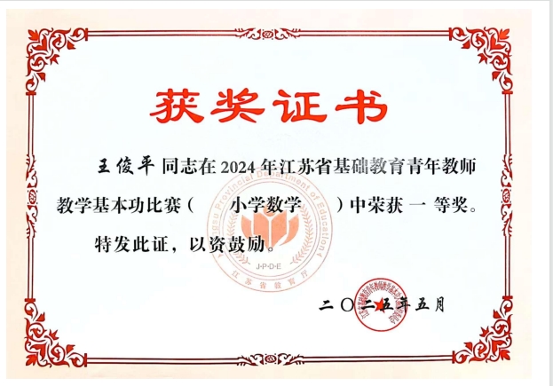 王俊平老师2025年获江苏省基本功一等奖