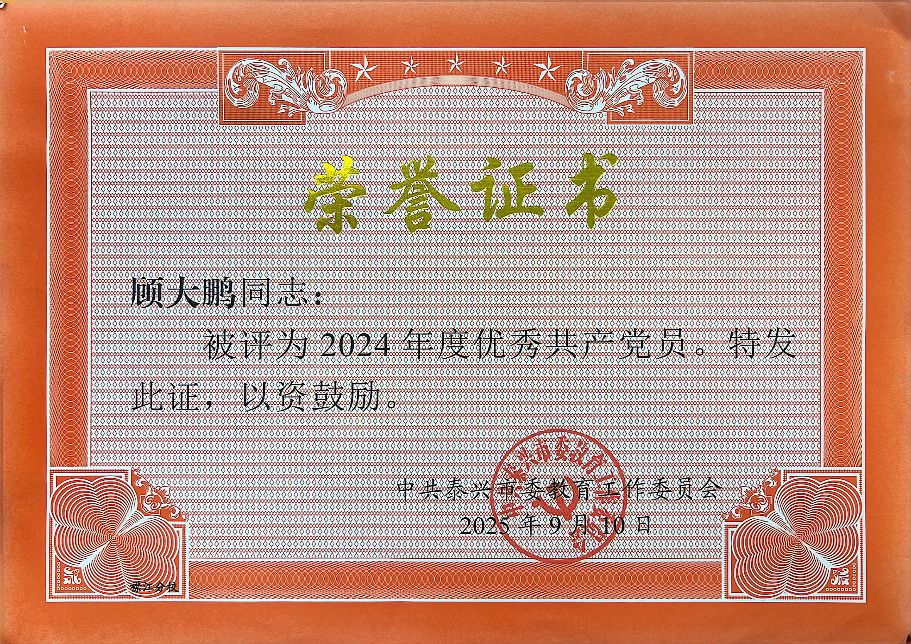 顾大鹏老师被评为泰兴市优秀共产党员