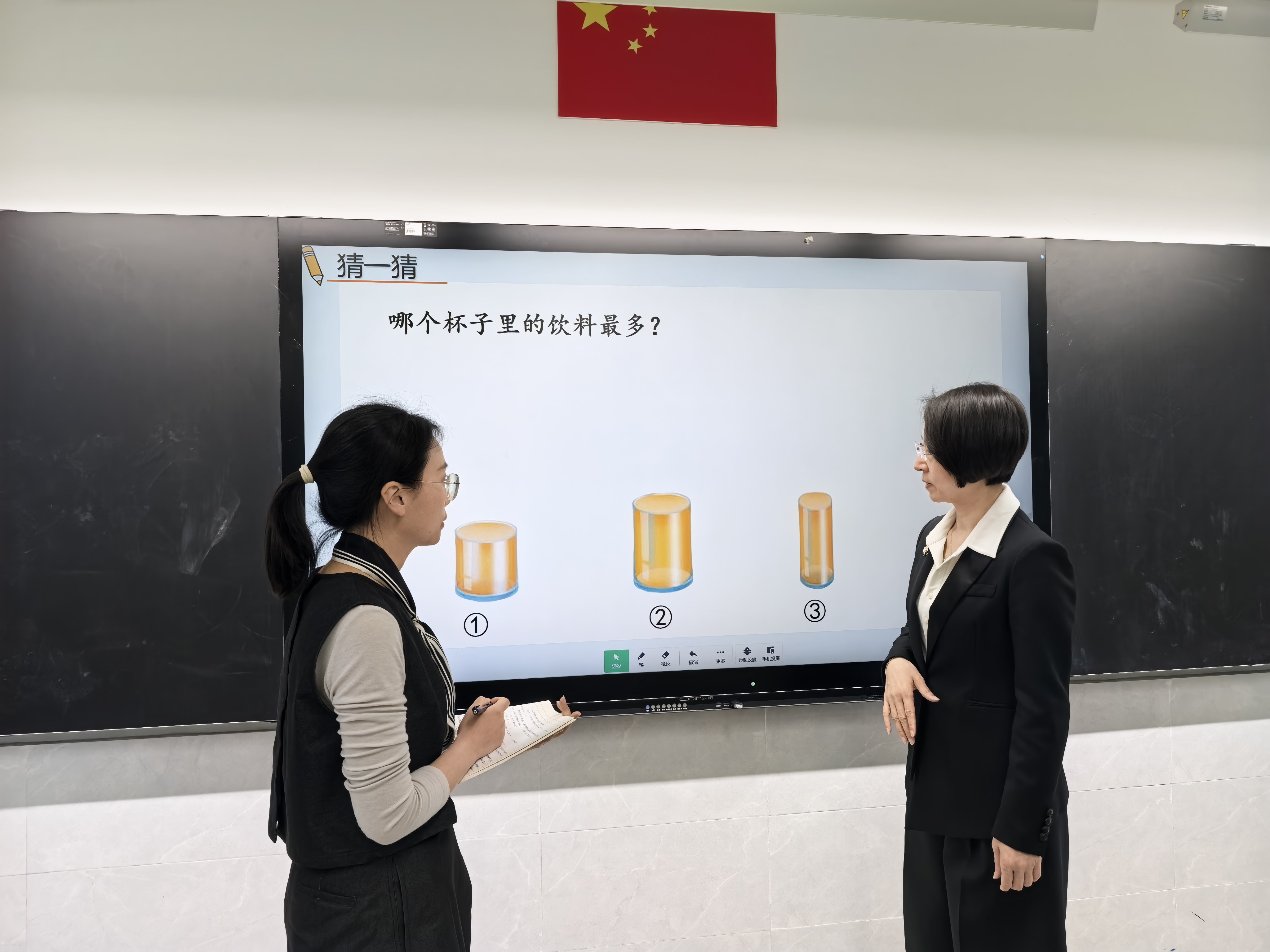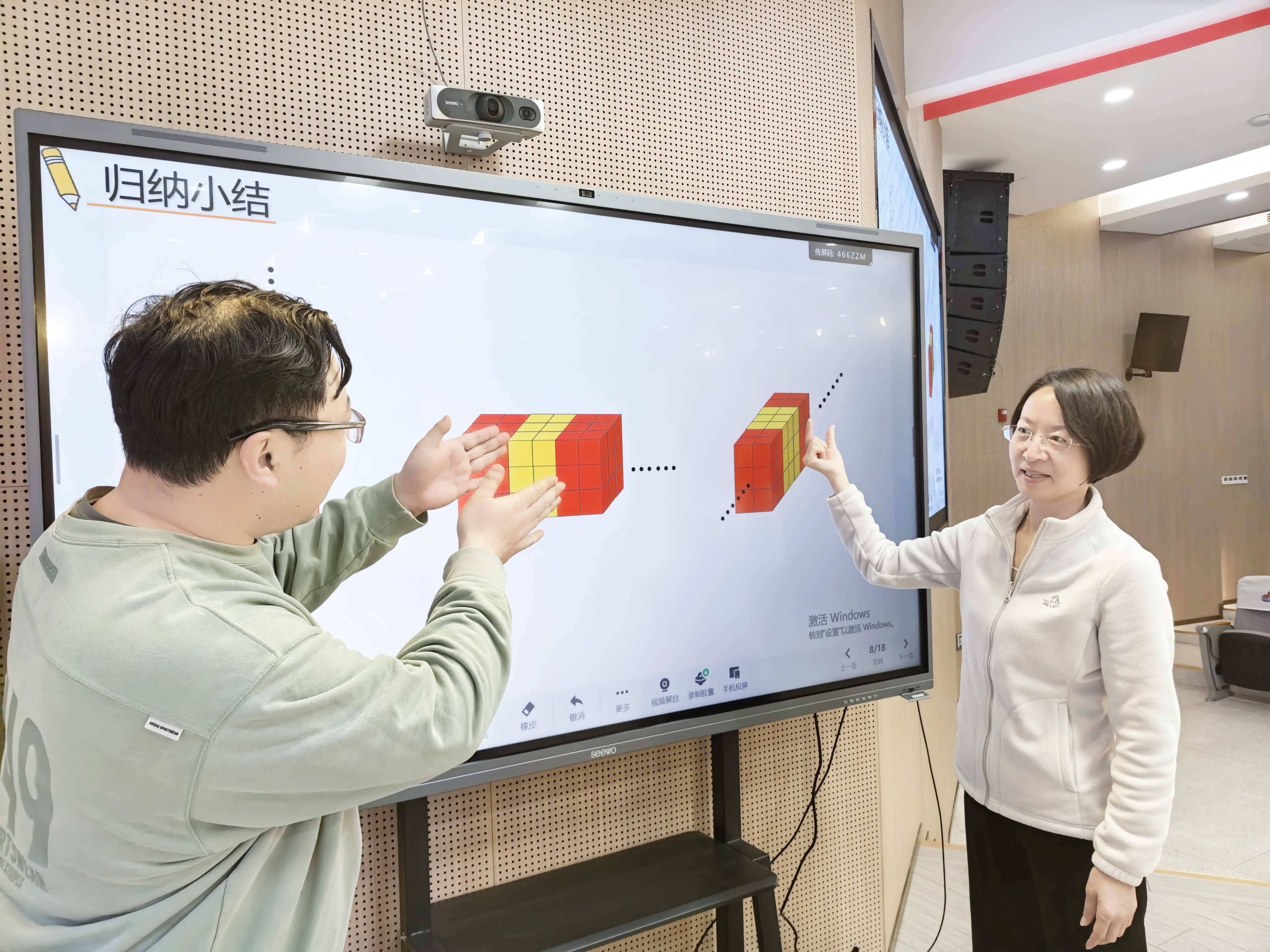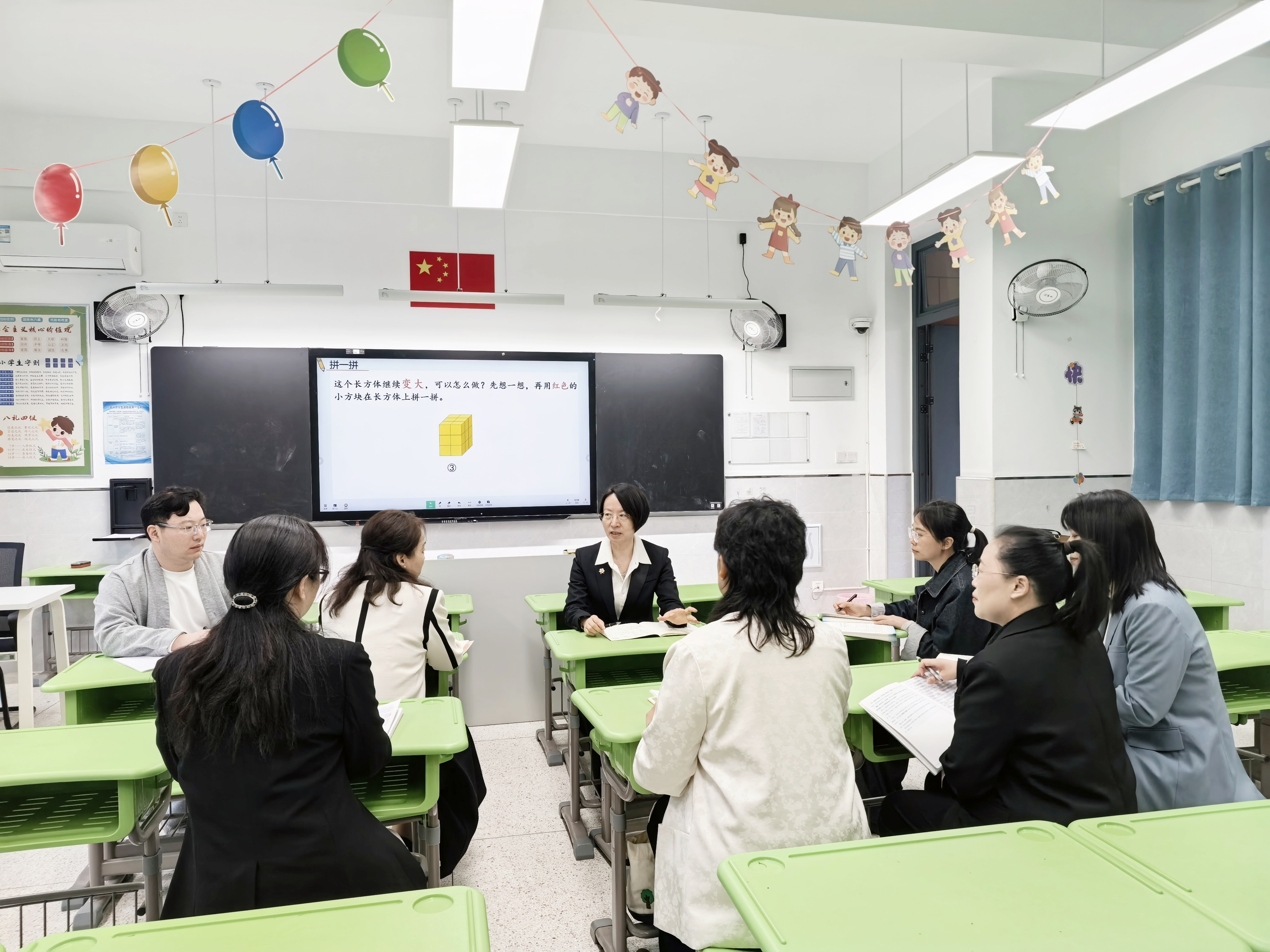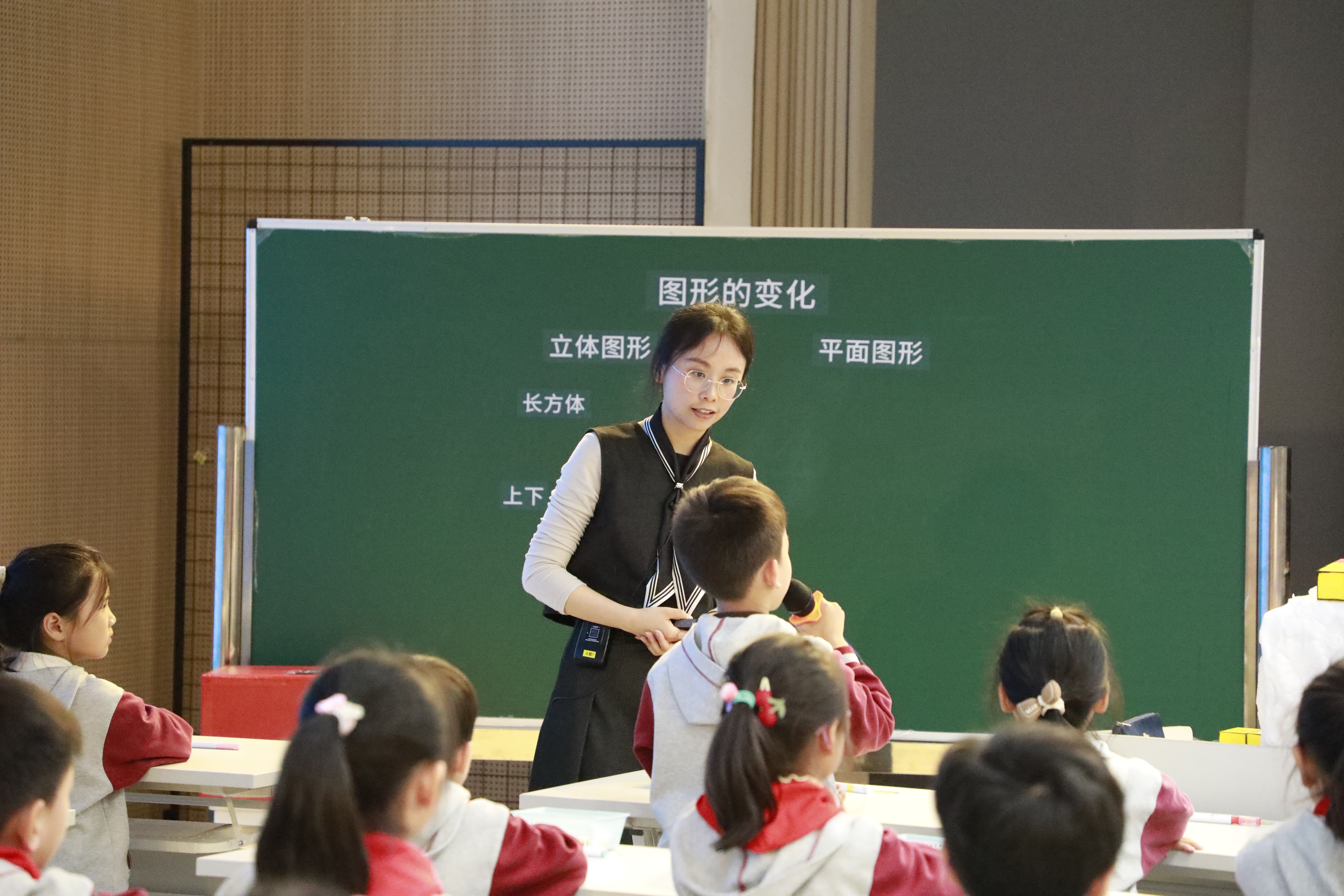 襟江分校葛明老师以趣味情境“孙悟空的金箍棒”导入新课,引导学生借助小正方体拼搭、在钉子板上围图形等活动,直观理解立体图形与平面图形在变化中的联系与区别,在动手实践中发展空间观念。同时借助饮料杯比容量、图形变小等挑战性任务,培养学生的应用意识与逆向思维。