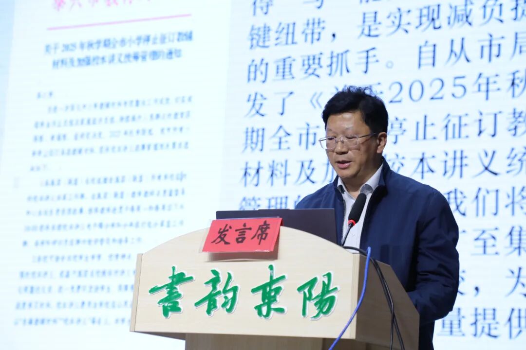 市教育局副局长叶副权也发表讲话,他强调了三个核心要点:一是在 “停”(停止教辅征订)与 “进”(推进校本作业)的平衡中,构建科学系统的机制制度;二是在 “统”(集团统筹)与 “分”(校区自主)的协同中,打造精准适切的校本讲义;三是在 “增”(提升作业质量与育人价值)与 “减”(减轻学生负担)的调控中,确保校本作业使用效果落地。叶局长的讲话为后续校本作业的开发与使用明确了方向,提供了系统性部署。