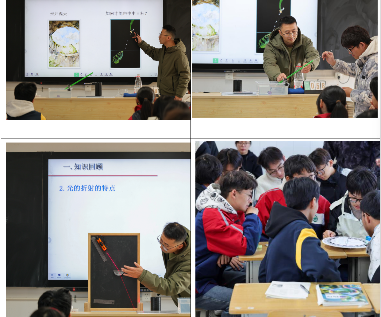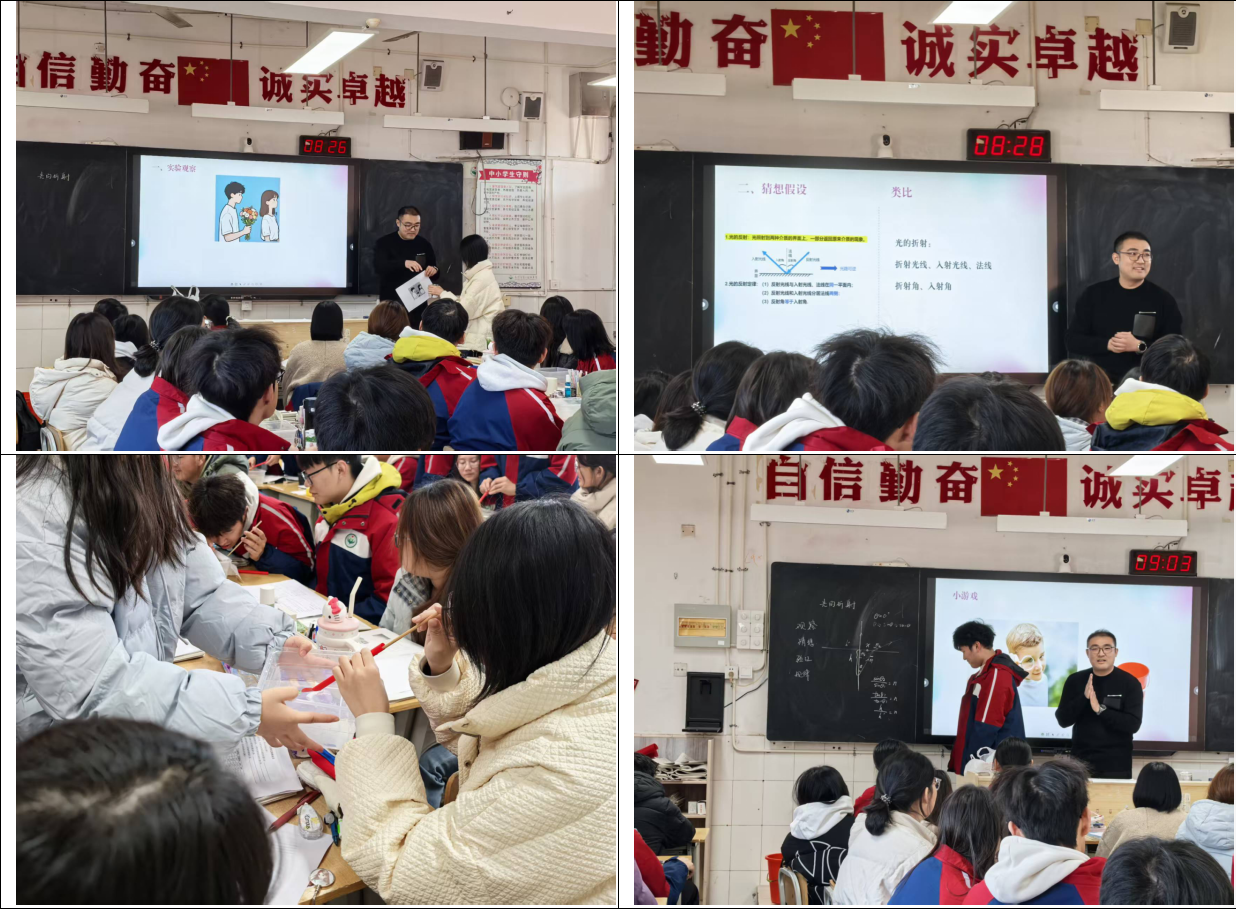 于志铖老师的《光的折射》公开课,以核心素养为锚点,以趣味情境为引线,以科学探究为核心,构建了一堂兼具知识性、体验感与思维深度的优质课堂。开篇“表白水杯注水显影”的创意情境,瞬间点燃学生好奇心,自然切入光的折射现象探究;科学探究环节复刻斯涅尔实验,学生通过数据分析验证折射定律,在光路可逆实验中亲眼见证光线原路返回,充分感受科学发现的乐趣。 他概念深化环节设计巧妙,“水中显字”游戏让学生在桶底文字随注水“浮现”的惊喜中,齐声读出“我学会啦”,既强化了知识理解,又收获满满成就感。课堂紧扣物理观念、科学探究、科学思维、科学态度与责任四大核心素养,通过生活实例(射水鱼击中昆虫)巩固知识应用,分层作业设计兼顾基础与拓展,实现因材施教。本节课更具示范意义:以探究式教学复刻科学史,融合数学近似推导视深公式,推动核心素养落地生根;启发教师在教学中注重学生体验感与跨学科思维培养,助力物理课堂从知识传授向能力提升转型,为全市物理教学提供了宝贵的实践范例。