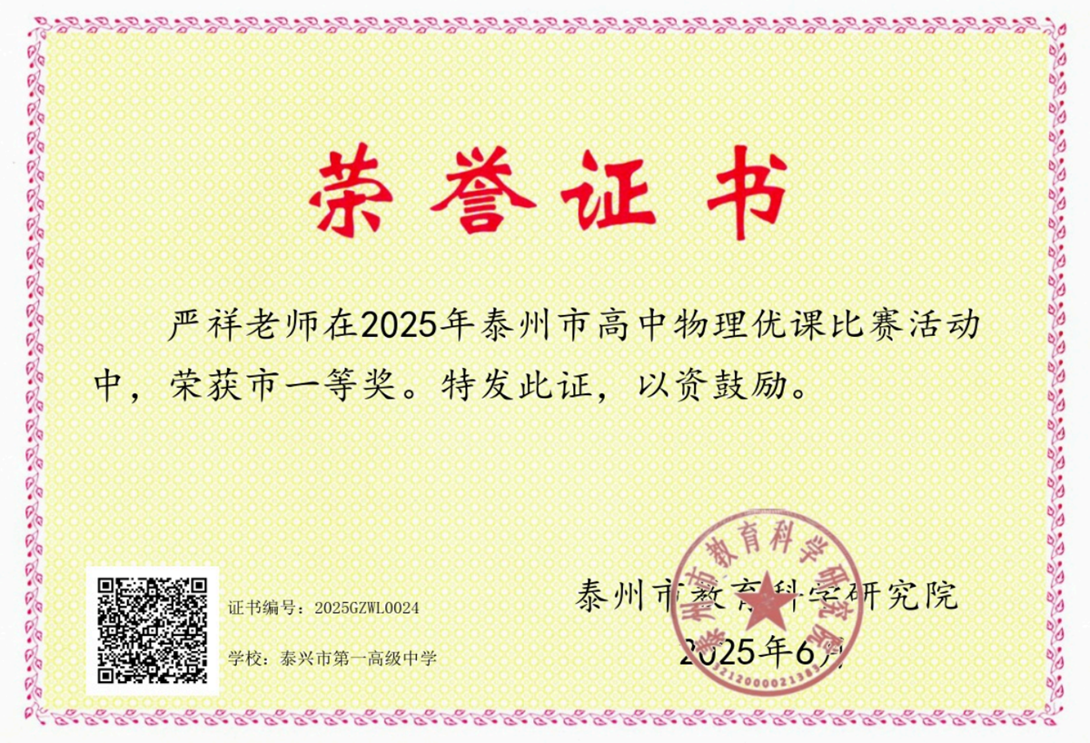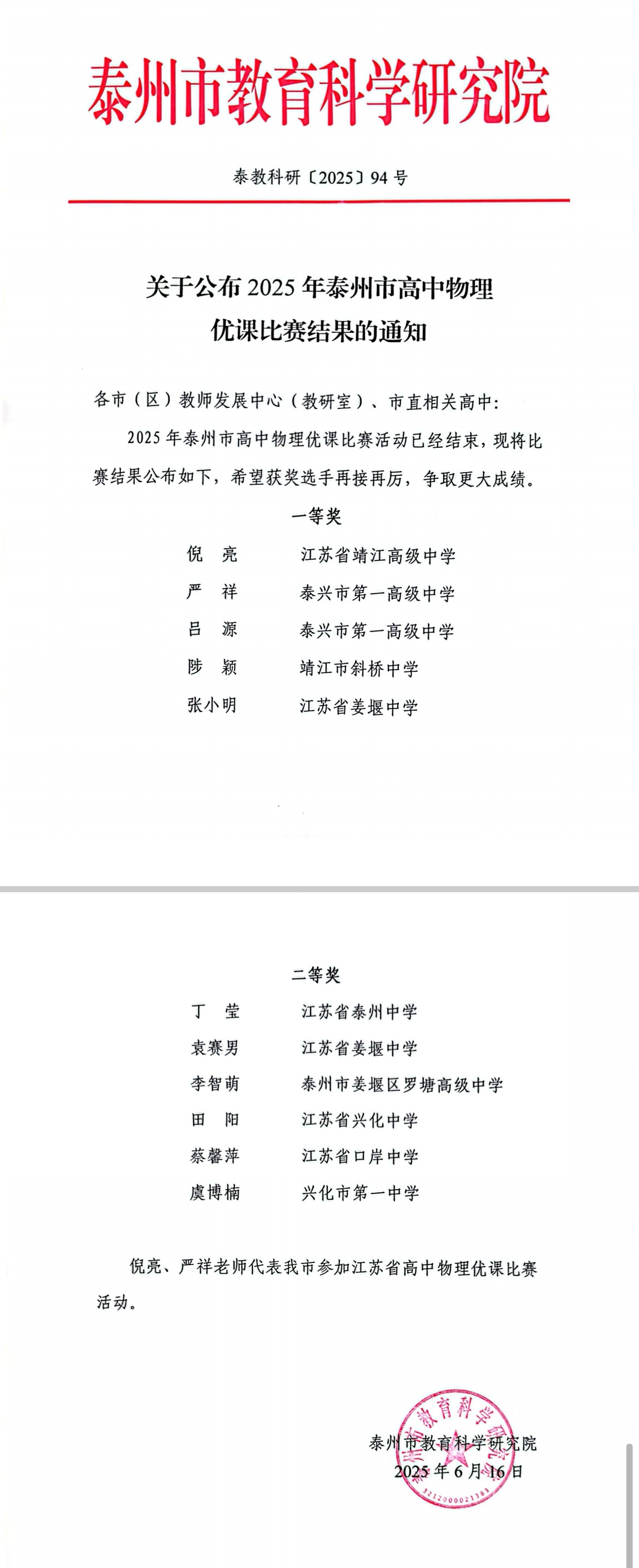 在泰州教育局组织优质课比赛中,严祥老师凭借出色的表现荣获泰州市优质课比赛一等奖,陆振华老师荣获泰兴市一等奖,特此报喜!