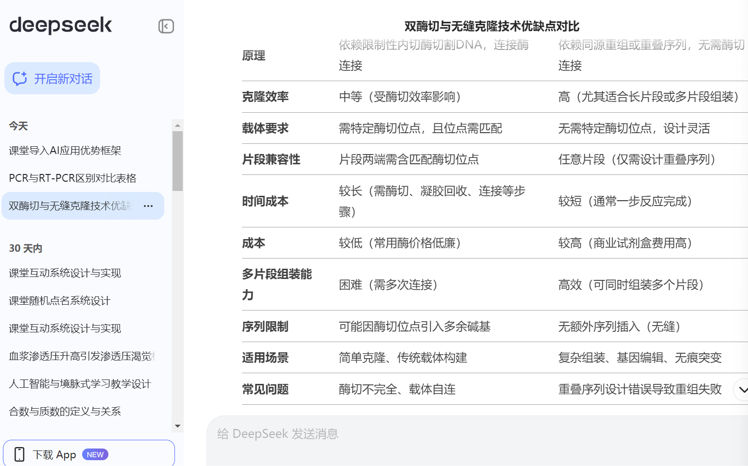 朱老师为了助力学生透彻理解双酶切克隆与无缝克隆技术的核心差异,创新性地采用了独特的教学方式。课堂上,朱老师当场调用DeepSeek,迅速生成双酶切法与无缝克隆技术的优缺点对比图。学生们依据这一清晰直观的对比图,对自己先前总结的相关知识展开深入比较与细致剖析,在此过程中,逐步形成批判性思维。