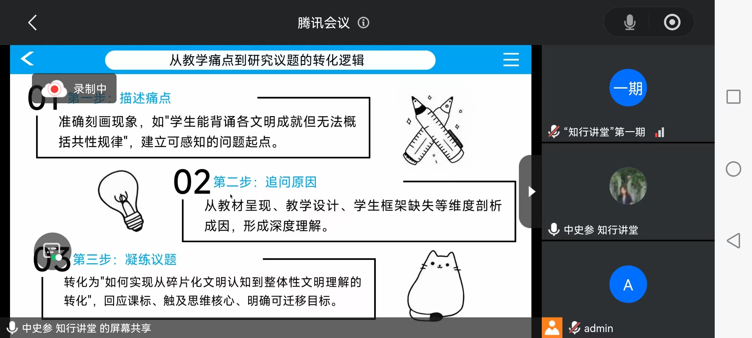 活动前夕,全体成员参加了由《中学历史教学参考》主办的“知行讲堂”第一期线上学习。本次讲堂以《从课堂“真问题”到期刊好文章——以〈中外历史纲要(下)〉“古代文明的产生与发展”为例》为主题,由郭响宏老师主讲。讲堂聚焦“立德树人根本任务在历史课堂的落实”“历史学科核心素养在教学的落地”“数智技术与学科融合赋能”等核心议题,倡导“知行合一,知从行来”的教育理念,引导教师从教学一线生长出鲜活的实践智慧,将课堂困惑转化为研究课题,将教学经验沉淀为学术表达。成员们纷纷表示,这种“与作者面对面”的叙事式分享,为今后撰写教学论文、实现“教—学—评—研”一体化提供了极具操作性的路径。