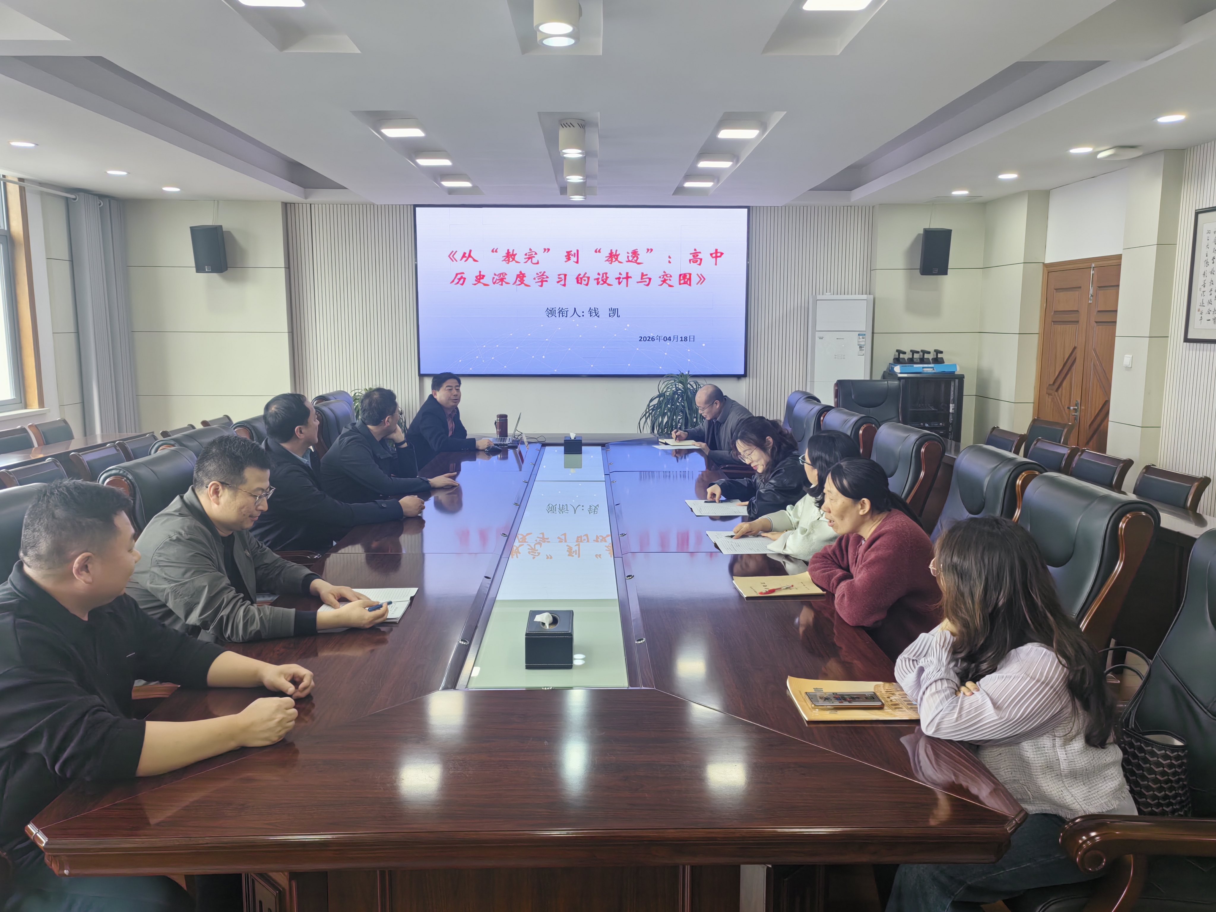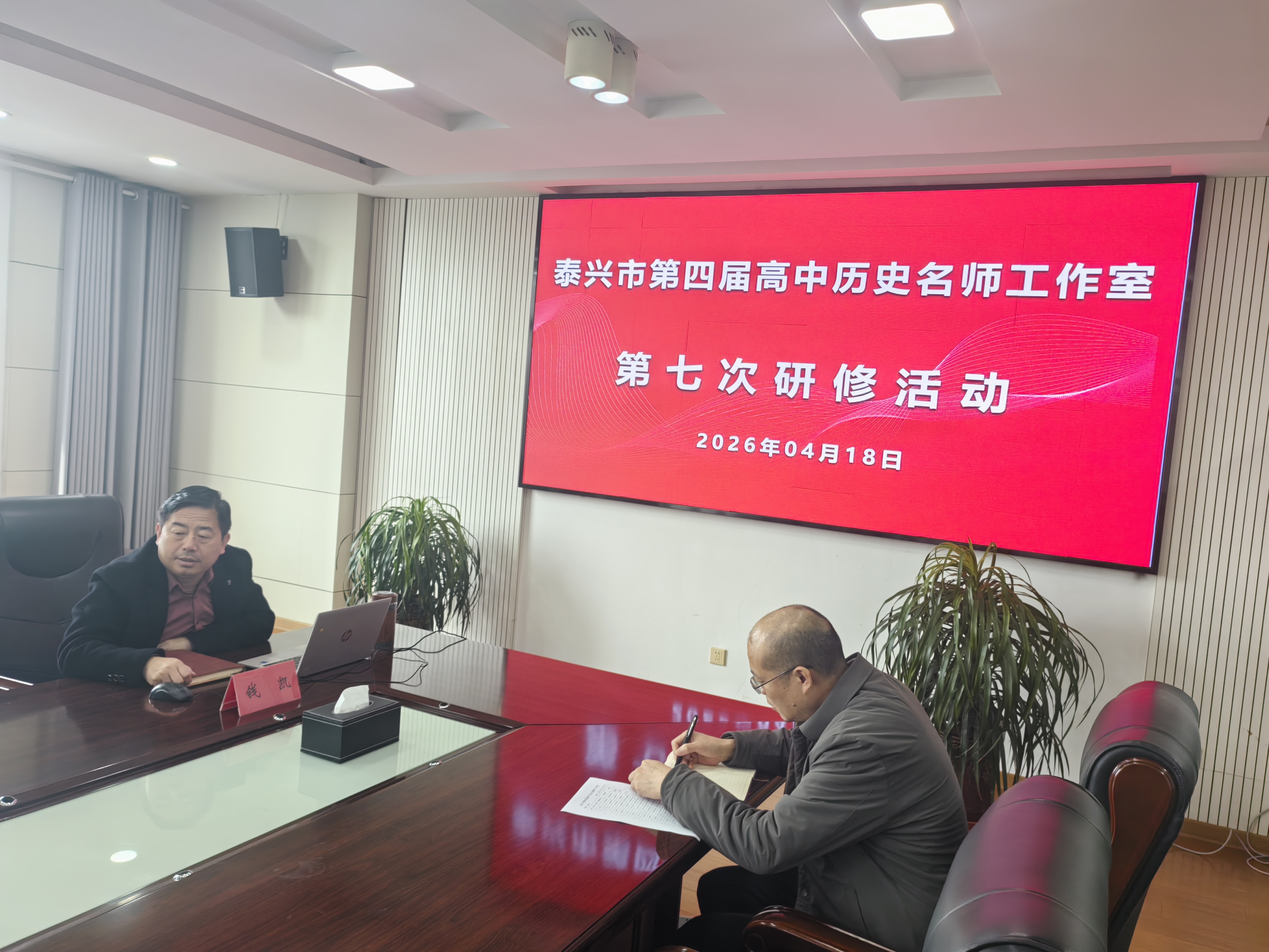 为拓展教育视野,促进名师培养工作向更高层次发展,推动高中历史教学从“知识覆盖”走向“深度理解”的进阶,2026年4月18日下午,泰兴市第四届高中历史名师工作室第七次研修活动在泰兴市第一高级中学思贤楼五楼一号会议室顺利举行。本次活动采用“线上+线下”相结合的方式,特邀南京外国语学校历史学科教研组长周媛媛老师、泰兴市教育局历史教研员季琴主任参会指导,工作室全体成员及基地学校历史教师共同参与。