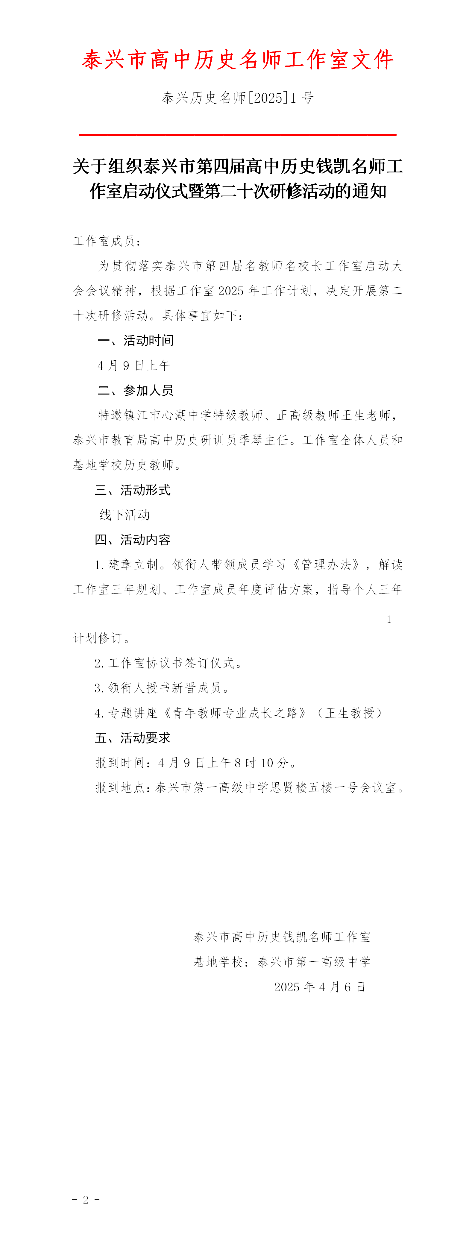 关于组织泰兴市第四届高中历史钱凯名师工作室启动仪式暨第二十次研修活动的通知