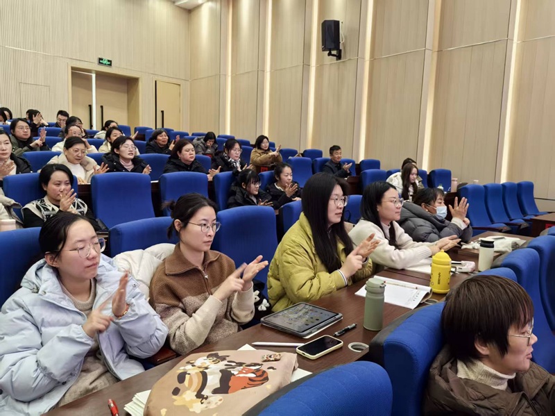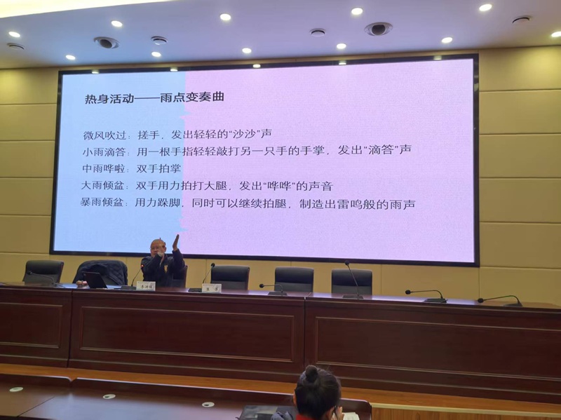 活动伊始,一场别开生面的 “雨点变奏曲” 热身活动点燃了现场氛围。参训教师们通过搓手模拟 “微风吹过”、轻敲手掌呈现 “小雨滴答”、双手拍掌演绎 “中雨哗啦”、拍打大腿展现 “大雨倾盆”、跺脚配合拍腿还原 “暴雨倾盆”,在生动有趣的互动中迅速放松身心、凝聚共识,为后续的深度研修奠定了良好基础。