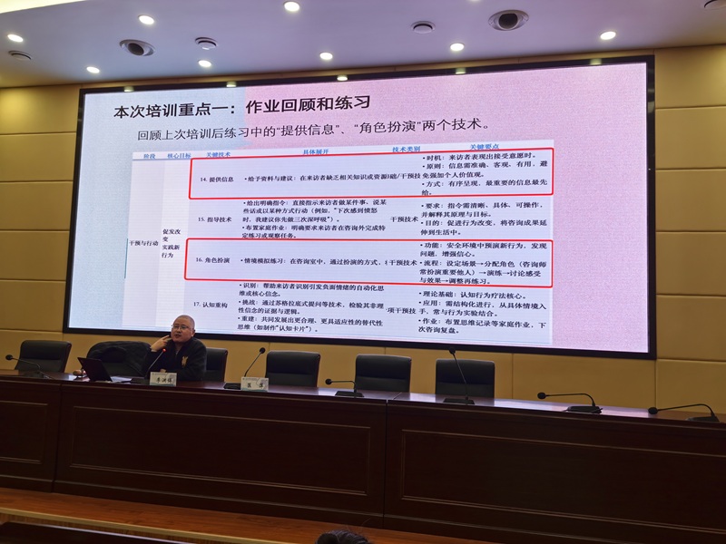 李老师聚焦作业,对 “提供信息”“角色扮演” 两项核心技术的运用情况进行全面复盘。李老师以学生考试焦虑典型个案的逐字稿为切入点,引发全体参训教师的深度思考。通过案例拆解、技术研讨、互动交流等形式,深入剖析考试焦虑背后的心理机制,详解咨询核心技术的运用要点,为参训教师提供了极具针对性的实践指导。