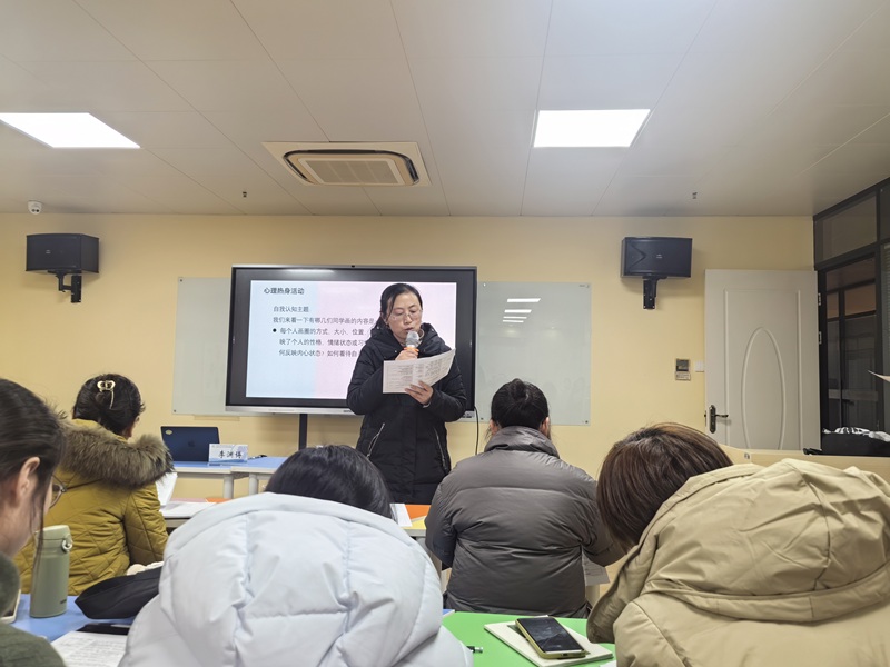 培训伊始,一场特别的热身活动拉开了序幕。参训教师们以“自我认知”为主题进行“自画像”创作,按照指令,有人画成靶心状的三个圈,有人勾勒简洁的脸庞,还有人用方框将圆圈整体框住。创作完成后,大家展示画作、寻找风格相近的同伴,通过这种投射式互动,快速拉近彼此距离,同时直观感受不同思维模式下的自我表达。这个热身活动不仅打破了常规开场的沉闷,更让老师们深刻领悟到:同一个热身活动,通过不同的引导与解读,能够灵活适配各类主题活动。