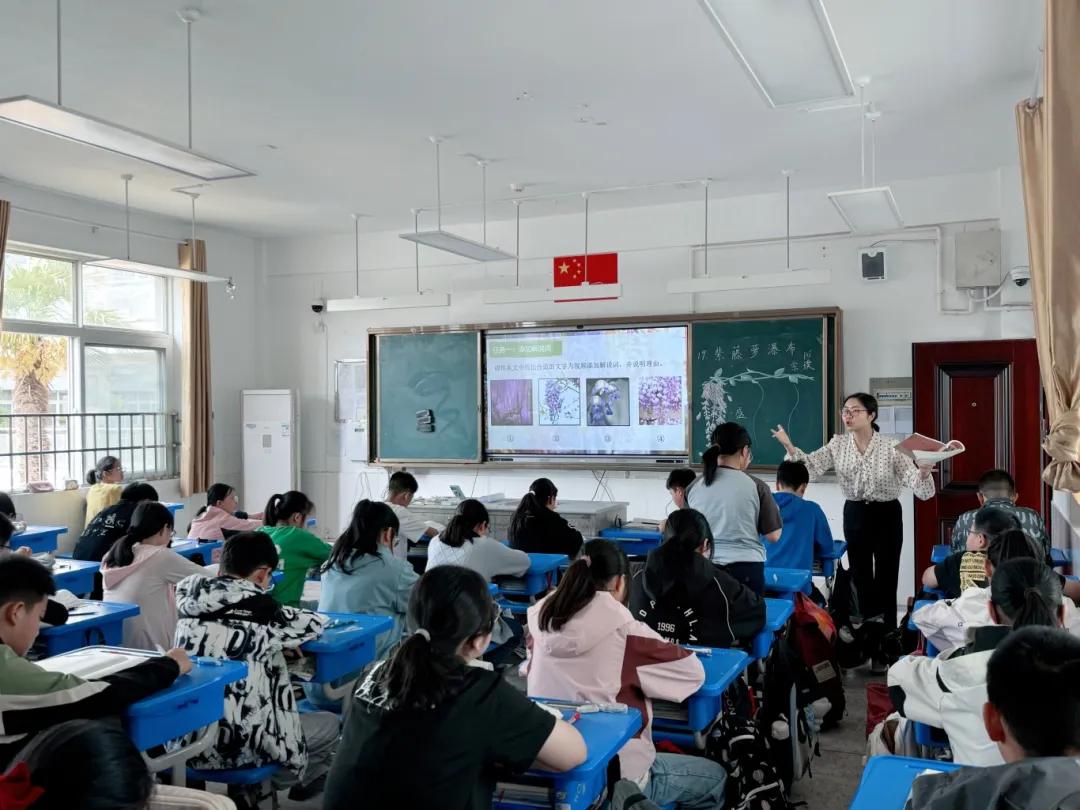 初一年级语文课堂,符晶晶老师以宗璞的《紫藤萝瀑布》为媒,用温柔细腻的语言与生动的肢体表达,将紫藤花“如瀑如霞”的壮美景象娓娓道来,引导学生体悟生命的蓬勃与自然的永恒。