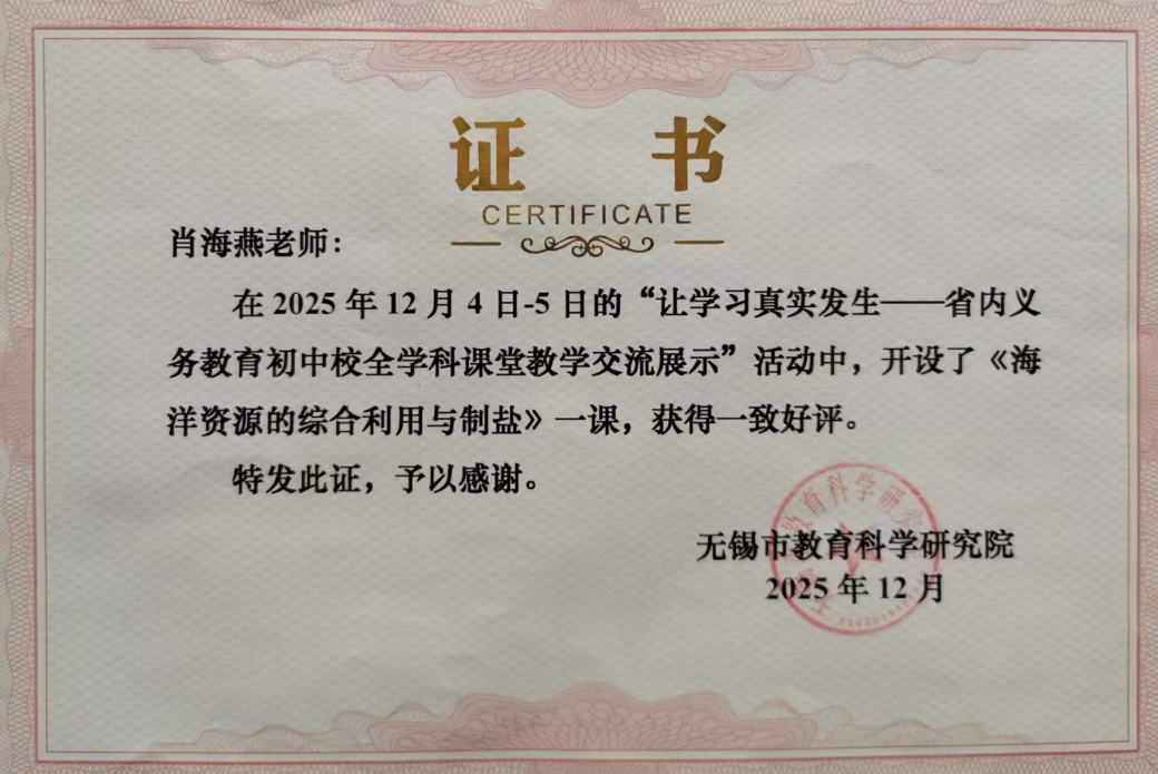 2025-12-06 肖海燕老师参加“让学习真正发生——省内义务教育初中校全学科课堂教学交流展示活动”