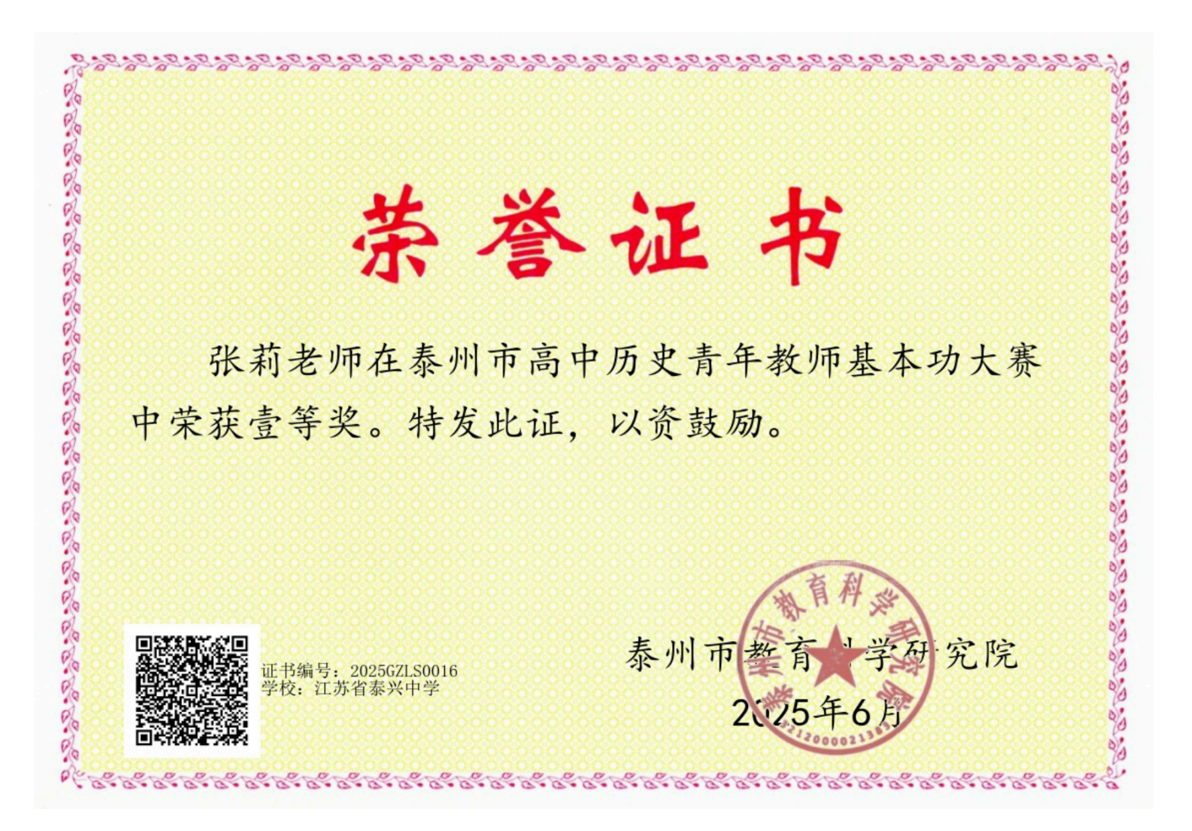 2025-11-26 祝贺张丽老师在泰州市青年基本功大赛中荣获一等奖
